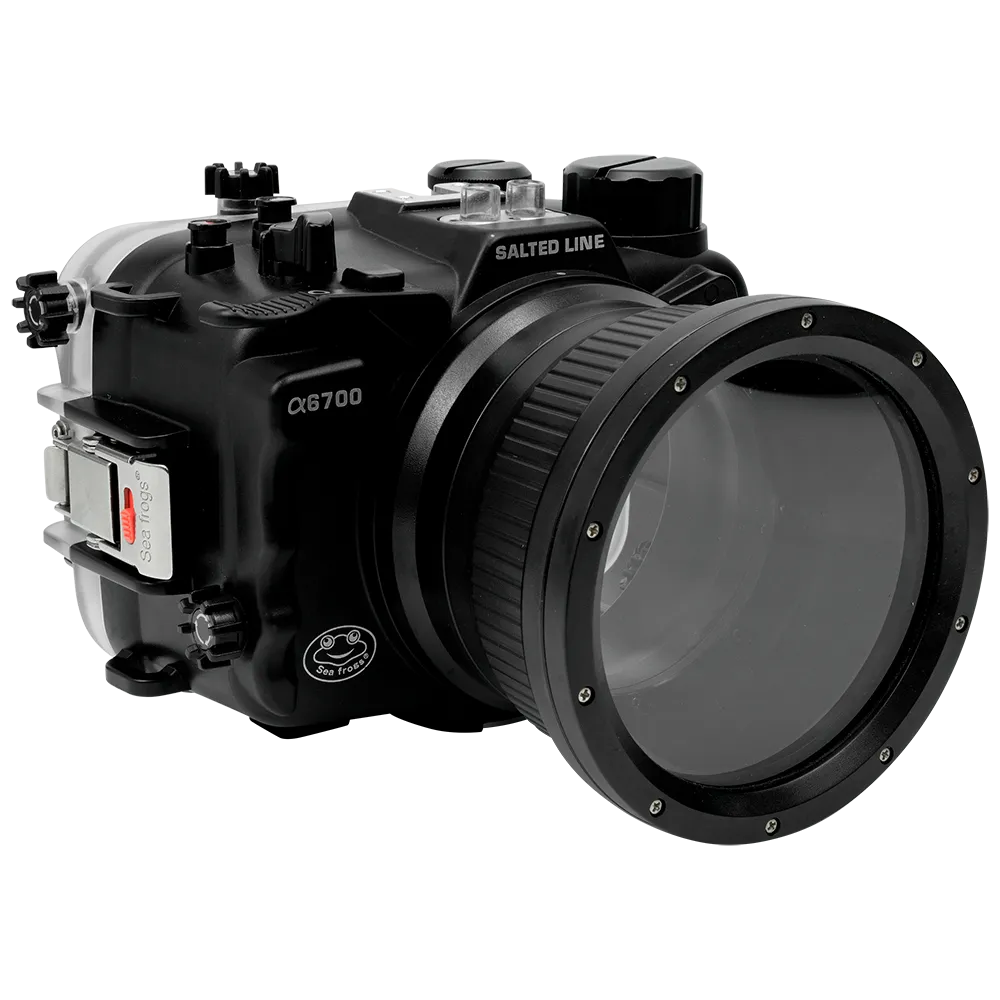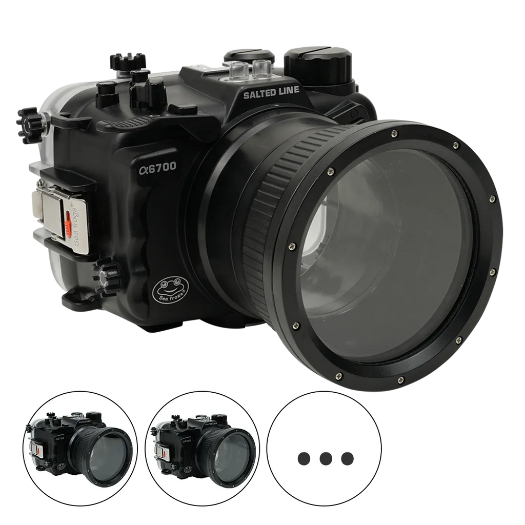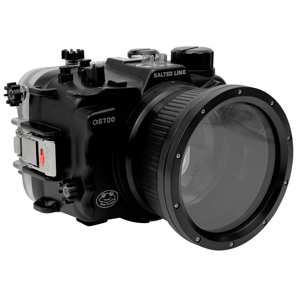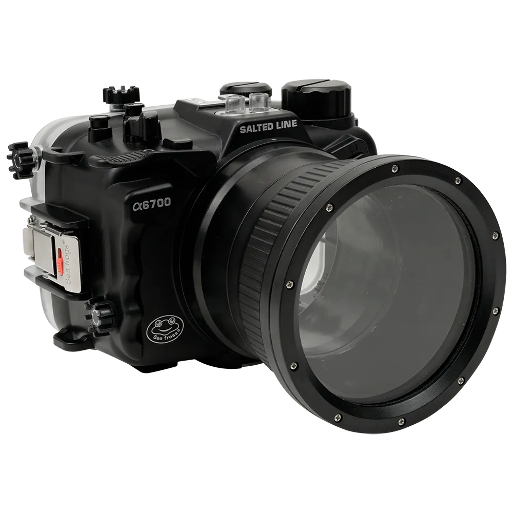 The Salted Line A6700 Housing with a 4-inch Optical Glass Flat Port bundle is perfect for both prime and zoom lenses when shooting at the water's surface. While they can be used for underwater photography and videography, remember that a flat port can decrease your lens's angle of view by up to 28%. For wide-angle and fisheye lenses, a dome port is recommended instead.