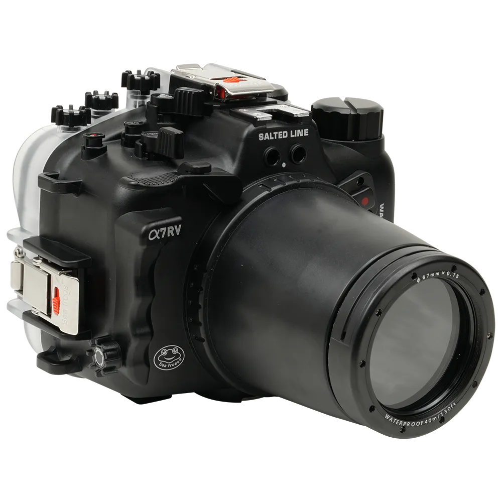 The Salted Line A7RV/A7V Housing with a 67mm-thread Optical Glass Flat Port bundle enables you to use a Sony A6700 camera with 'wet' close-up and wide-angle lenses underwater, enhancing your creative flexibility beneath the surface.